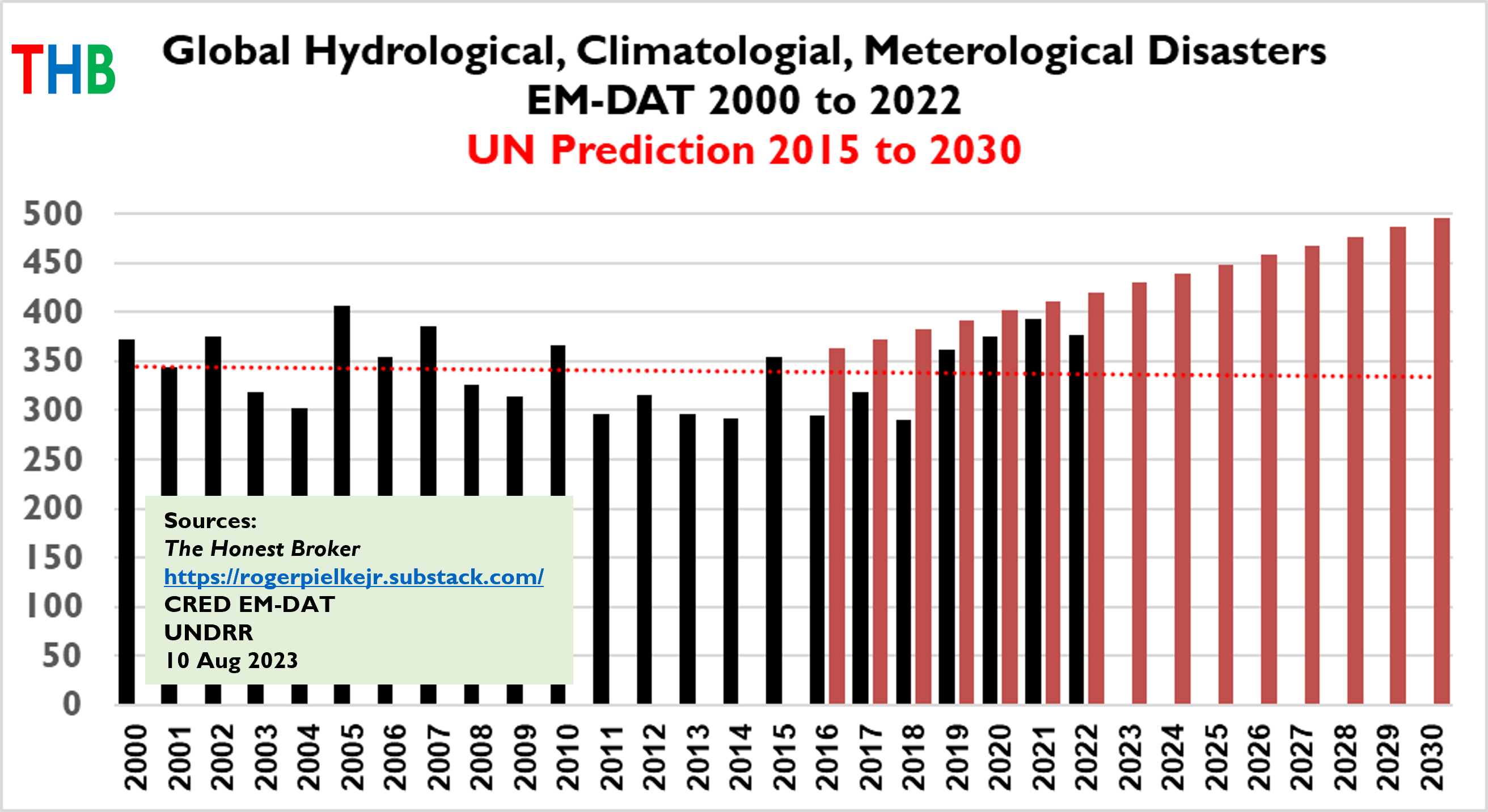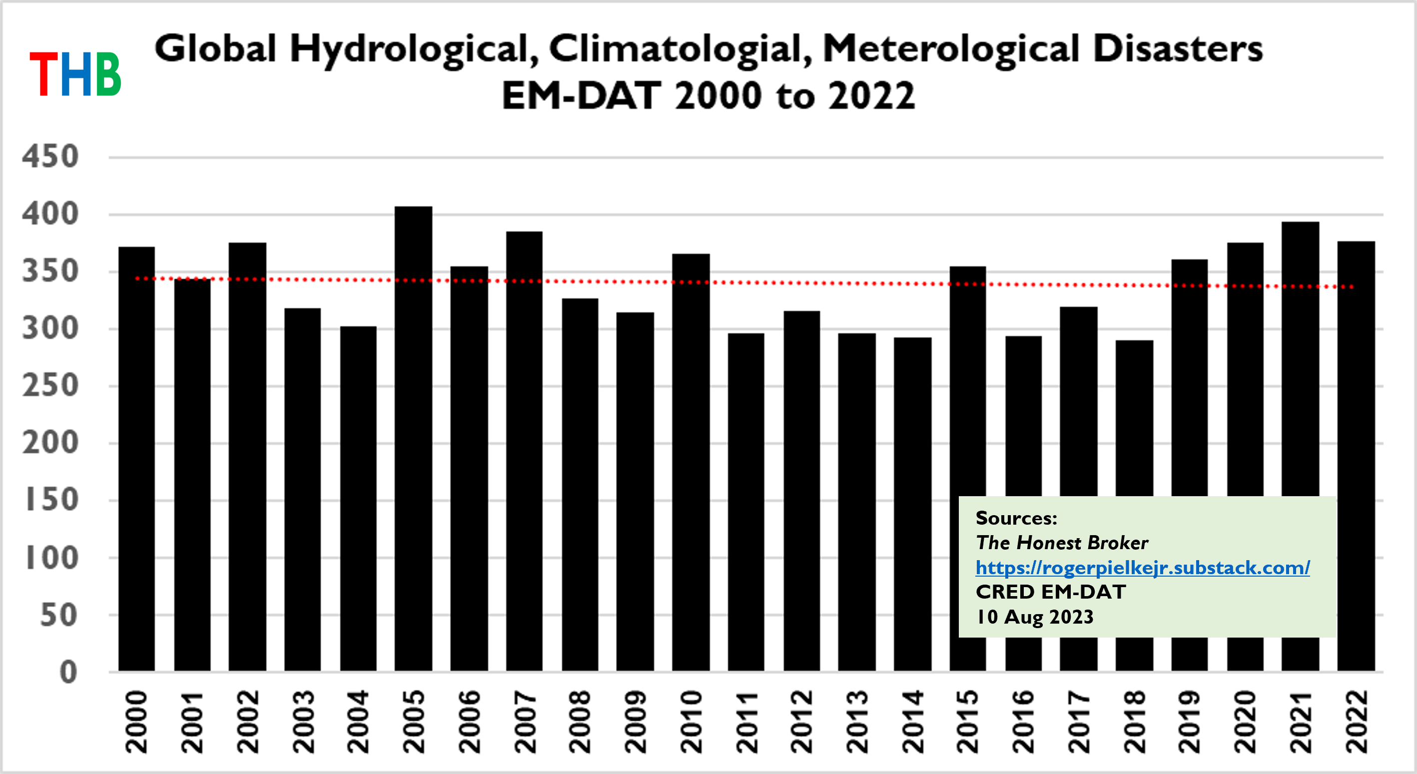Below is the updated time series of global hydrological, climatological and meteorological disasters in the EM-DAT database, along with the linear trend, over the period 2000 to 2022.