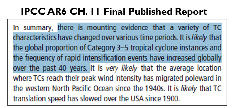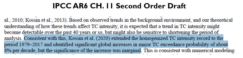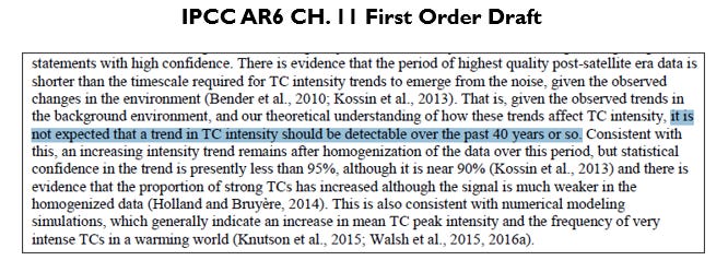 Below is the relevant discussion of tropical cyclone intensities in the First Order Draft (FOD) of IPCC AR6 Chapter 11 (hereafter, just Ch.11, and in the images below I have added the highlighting).