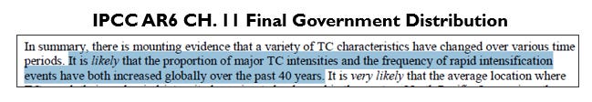 The Final Government Distribution draft of Ch.11 removed all of the nuanced text acknowledging the weak case for detection and the “marginal” significance of a study of tropical cyclone measurements (and not TCs directly). Strangely, newly added was a strong conclusion that was unsupported by the text, the word “likely” shows up and “marginal” disappears in its claim that the “proportion of major TC intensities” had increased over the past 40 years.
