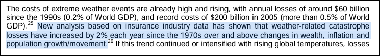 The Stern Review seems to have turned 1% into 2% and failed to acknowledge that over the longer-period 1950 to 2005, there was no increasing trend in losses as a proportion of GDP. The escalating increase in annual losses from 2% to 3%, 4%, 5%, 6% every decade is not supported in any way in the Stern Review, nor is it referenced to any source.