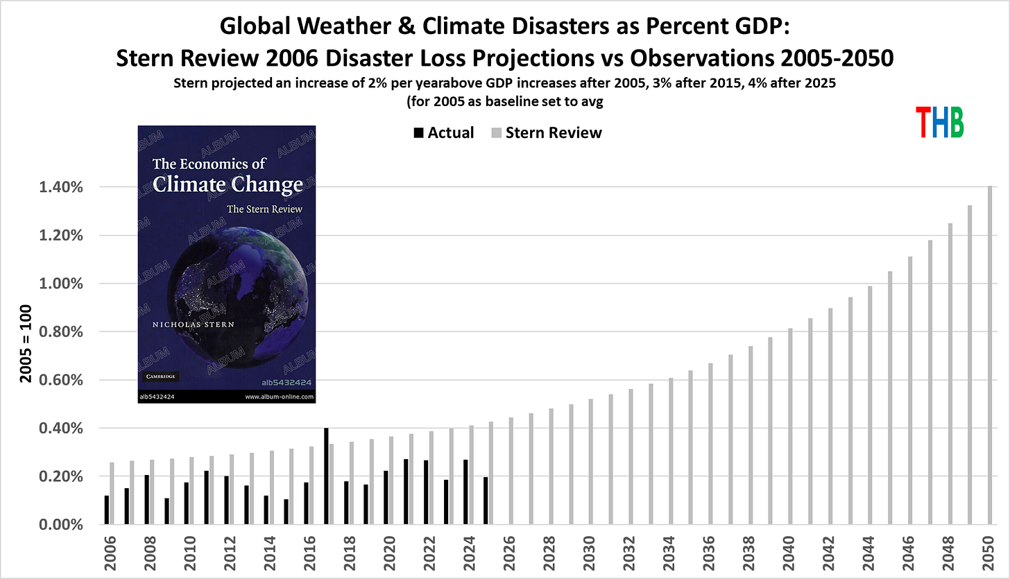 I have just updated through 2025 the figure below that compares the Stern Review’s prediction of post-2005 increases in disaster losses as a percentage of global GDP with what has actually transpired.