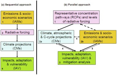 Typically, scenarios and climate projections had been connected in a sequential process, “with socioeconomic and emissions scenarios developed first and climate change projections based on those scenarios carried out next”. . . The development of the RCP scenarios was intended to re-order the scenario development timeline such that the characteristics of radiative forcing would be made available first to climate modelers, in the absence of underlying socio-economic and emissions scenarios which would follow later . . .