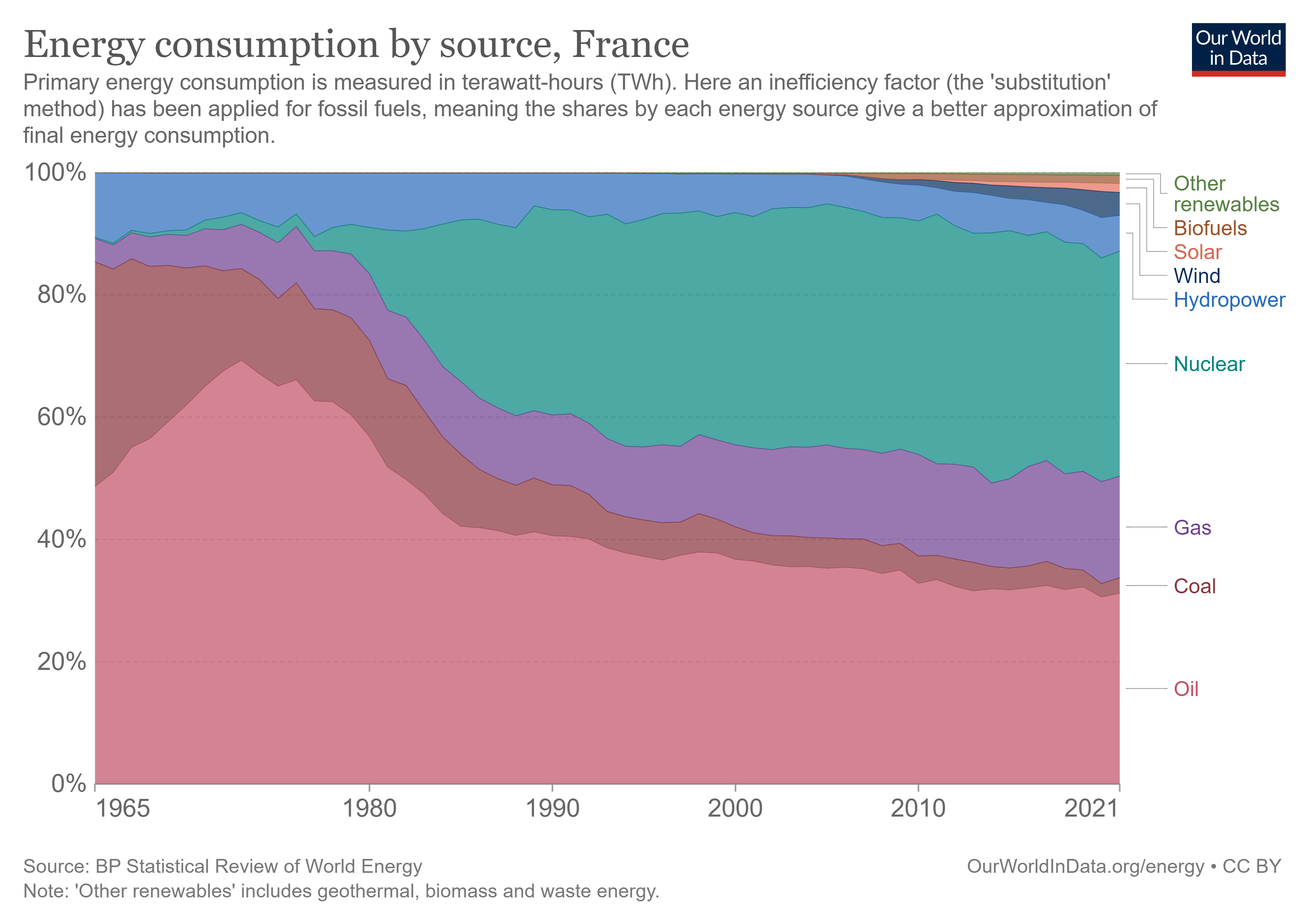 As a matter of empirical evidence, Epstein is just wrong. There are countless examples of the partial replacement of fossil fuels in large-scale energy systems. One example will suffice. Consider France.