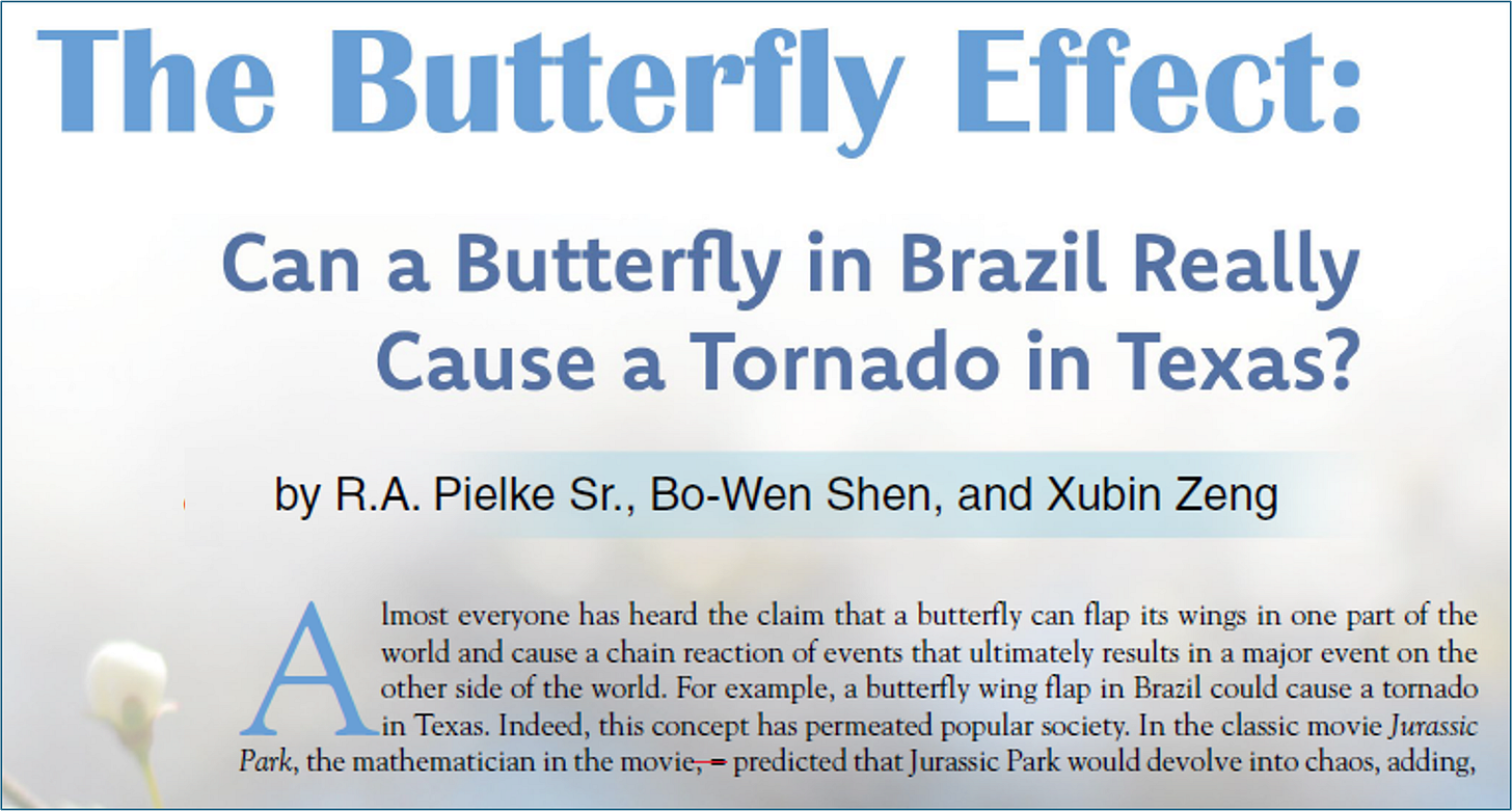 It has been a little while since we heard from Roger Pielke Sr. here at THB. (see his previous THB posts on carbon dioxide, ocean heat content, and land use effects on climate). He is a difficult guy to schedule — Right now he and my Mom are somewhere in Texas searching for clear skies to view today’s solar eclipse. Today, I am happy to share my father’s latest paper on the “Butterfly Effect,” forthcoming in Weatherwise and co-authored with Bo-Wen Shen of San Diego State University and Xubin Zeng of the University of Arizona. My father and colleagues have published many papers on chaos theory and predictability, and this paper brings some of that work to a broader audience. Below, I excerpt their forthcoming paper in a Q&A format and at the bottom of the post provide a link to the uncorrected page proofs (courtesy Dr. Shen). In the comments, please feel free to ask questions about the paper and I’ll be sure to corral my dad to join in and discuss! — RP2