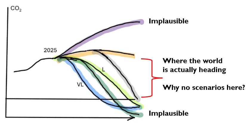 Similarly, there is a huge gap between very low scenarios and “frozen policies” — the orange one in the middle below, that assumes no policy changes from 2024. Incredibly and bafflingly, there are no scenarios proposed in what is arguably the most plausible range of futures.