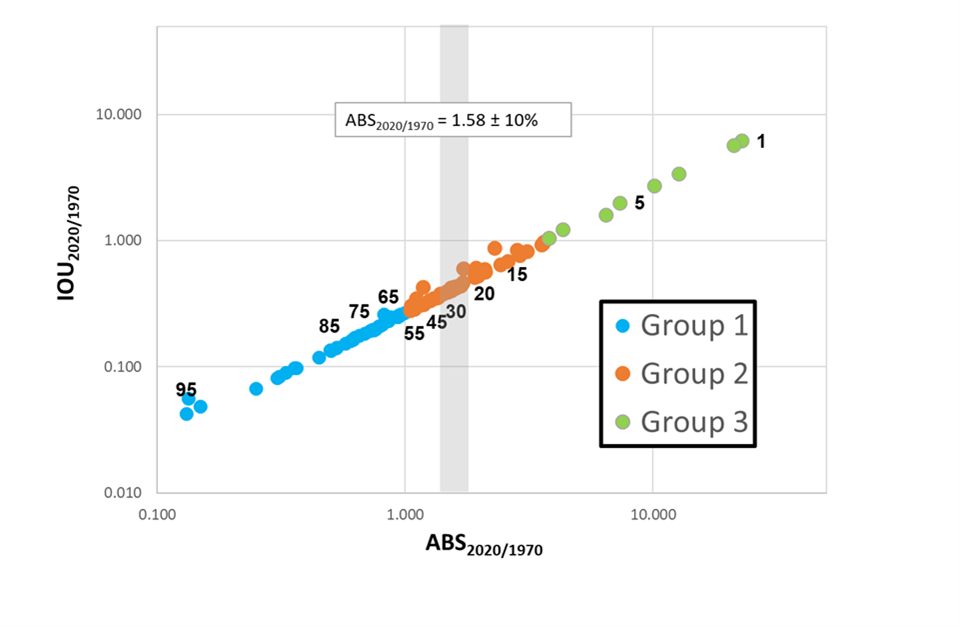 In the figure below, the X-axis denotes the ratio of absolute consumption of a commodity for the years 2020 and 1970 — ABS. The Y-axis denotes the same quantity divided by the annual GDP — the intensity of use or IOU.