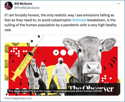 Over the weekend, Bill McGuire, an Emeritus Professor of Geophysical & Climate Hazards at University College London, set X/Twitter afire with the following Tweet, which foresees the “culling of the human population” as the “only realistic” way to address climate change — a Tweet which he later deleted:
