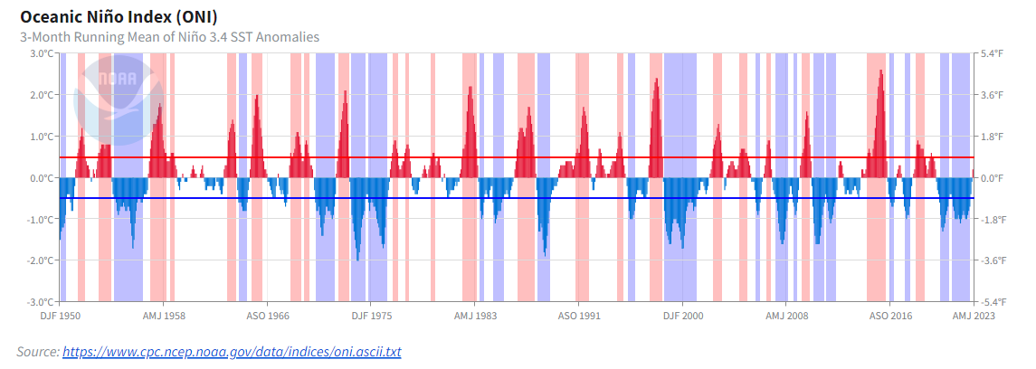 In the Niño 3.4 region, according to NOAA an El Niño occurs when SST anomalies (that is, the difference from baseline) are greater than 0.5 Celsius, and when the anomalies are less than -0.5 Celsius. that is called a La Niña. You can see the ups and downs of the oscillation in the figure at the top of this post, which also shows NOAA’s thresholds for El Niño/La Niña conditions and various periods when the thresholds were exceeded. Conditions that are neither El Niño or La Niña are called neutral. Right now the world appears to be entering the El Niño phase of ENSO.