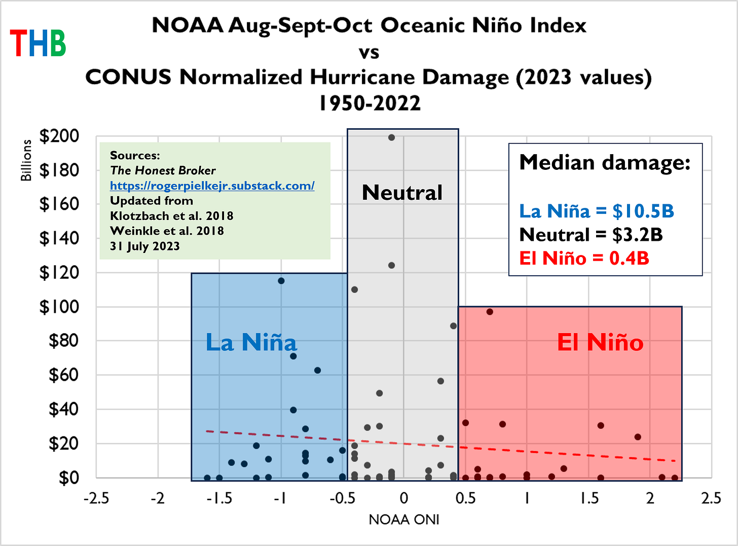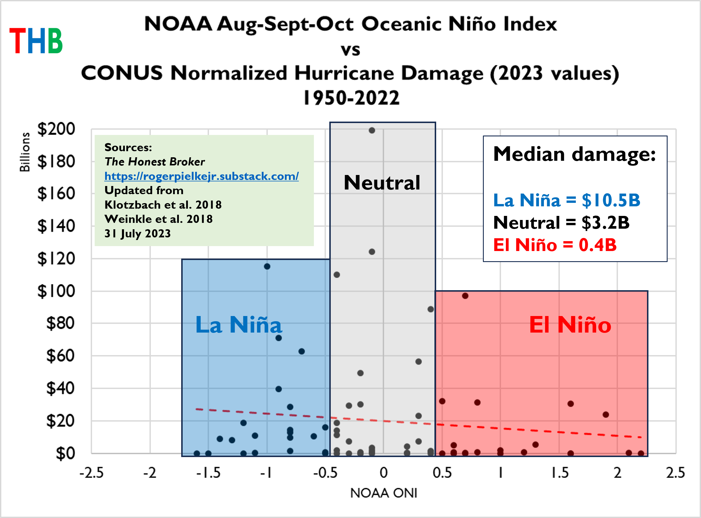 While there is a lot of scatter, there are also some strong signals. For instance, of the 21 El Niño years, 6 (~29%) saw no damage and 13 (~62%) saw < $1 billion. In contrast, the 21 La Niña years saw 3 with no damage (~14%) and only 6 (~29%) with <$1 billion.