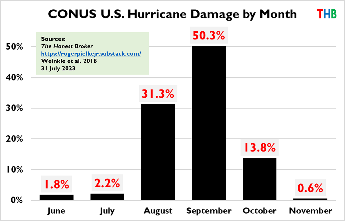 The figure below shows that more than 95% of normalized hurricane damage occurs in the months of August-September-October. U.S. hurricane damage is globally significant as it generally represents a majority of global catastrophe losses.