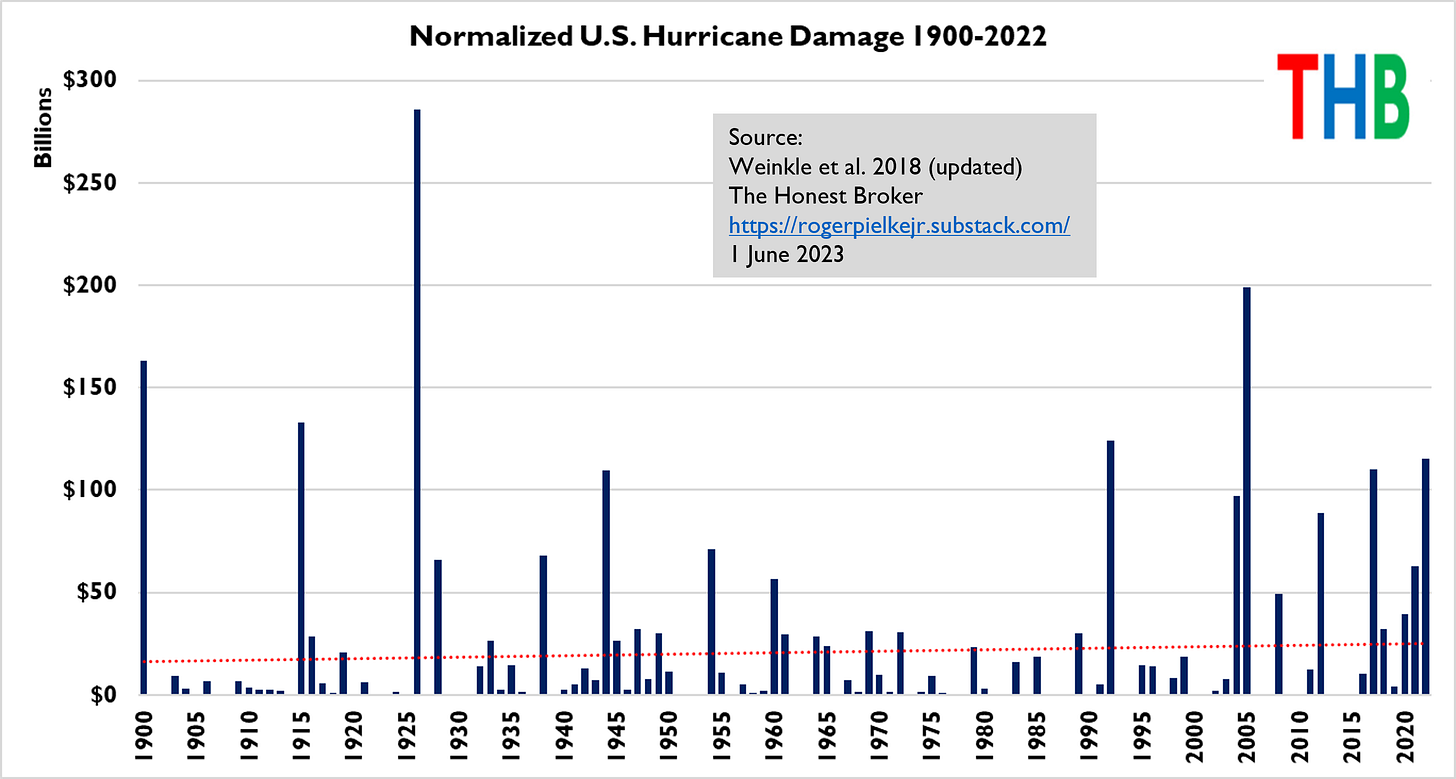 Along with one of Dr. Gray’s students, Chris Landsea, I wondered if those effects could be seen in our record of normalized continental U.S. hurricane damage. They sure could — we found a very strong relationship and more recently updated that original analysis. Today I provide a further update, using data through 2022.