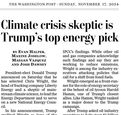The Washington Post: “Climate crisis skeptic is Trump’s top energy pick”2