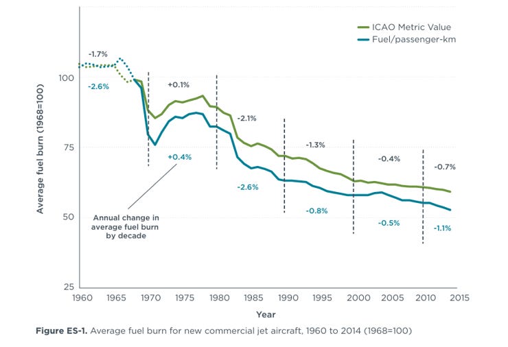 As an example, the figure below shows the significant improvement in fuel efficiency of jet aircraft from1960 to 2015. That improvement in efficiency means that each aircraft can perform the same or better travel services while using less fuel, reducing costs, boosting profits, and contributing to economic growth. Improved efficiencies make good sense independent of climate policies.