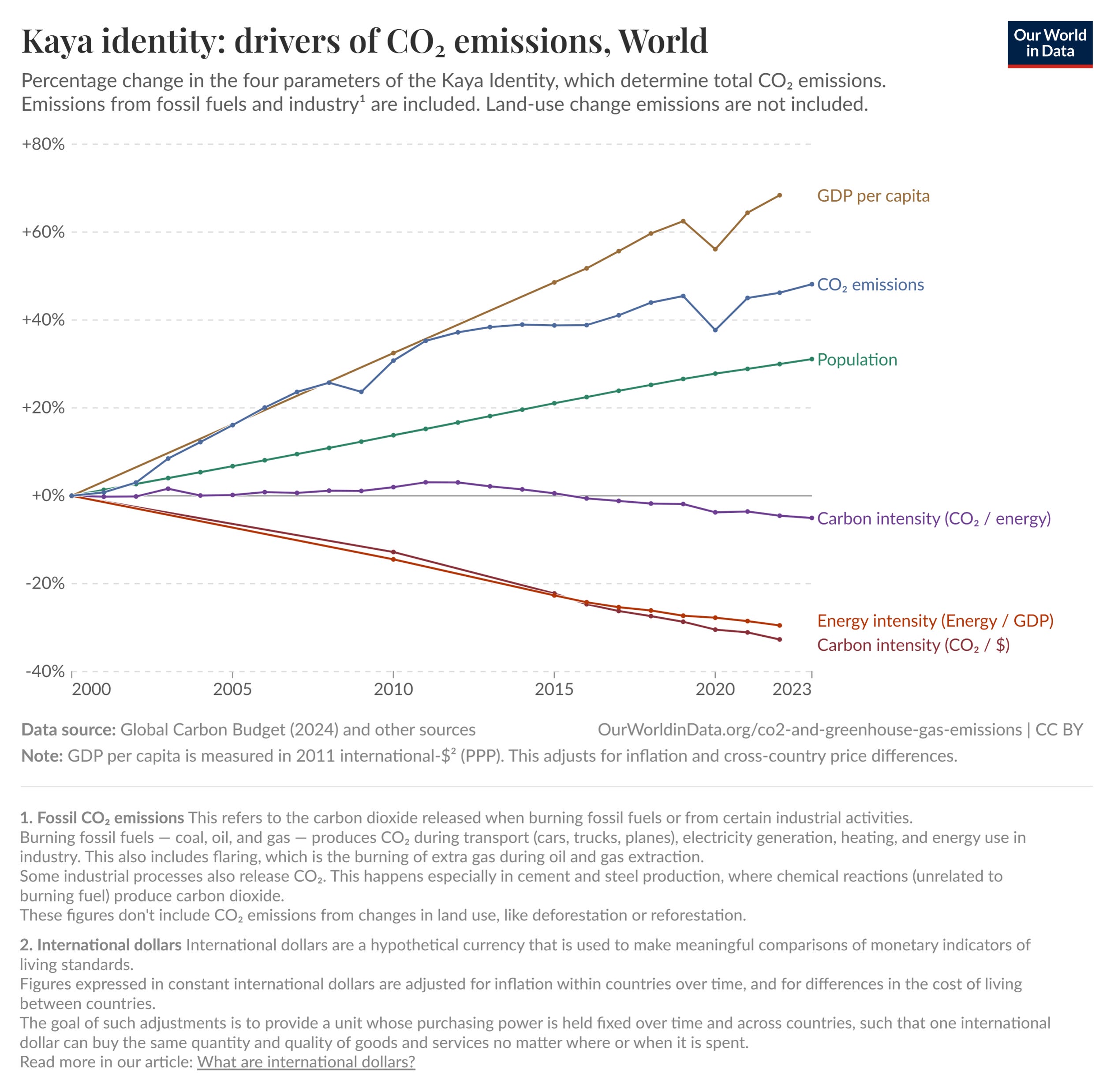 Together, these four factors combine to result in carbon dioxide emissions. The figure below shows how each of the four elements of the Kaya Identity have changed from 2000 to 2023.