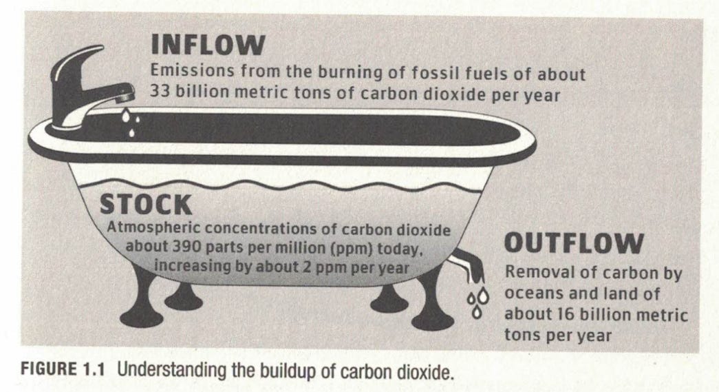 There are a few complexities, such as the fact that the oceans and the land absorb about half of the carbon dioxide that we emit — think of that like a small open drain in the bottom of the tub that lets some of the water out as it fills.
