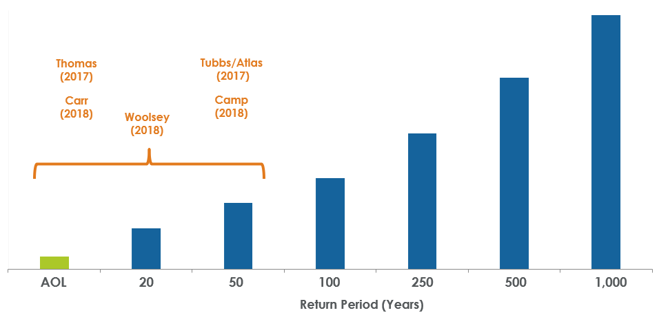 In modeling done after the 2017 and 2018 fire seasons and summarized in the figure above, AIR warned, “None of these recent U.S. wildfires, therefore, are considered tail events—rare events with high losses. Instead, these events have low return periods of less than 100 years, which reflects increasing U.S. wildfire risk, in large part due to development of the wildland-urban interface.” Risks are always must easier to see looking in the rear-view mirror.