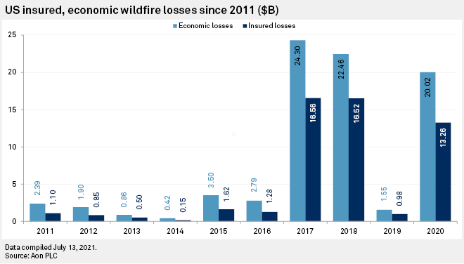 The image above illustrates this dynamic with U.S. insured wildfire losses, which were pretty benign until 2017, when losses approached the totals typically seen in hurricanes.