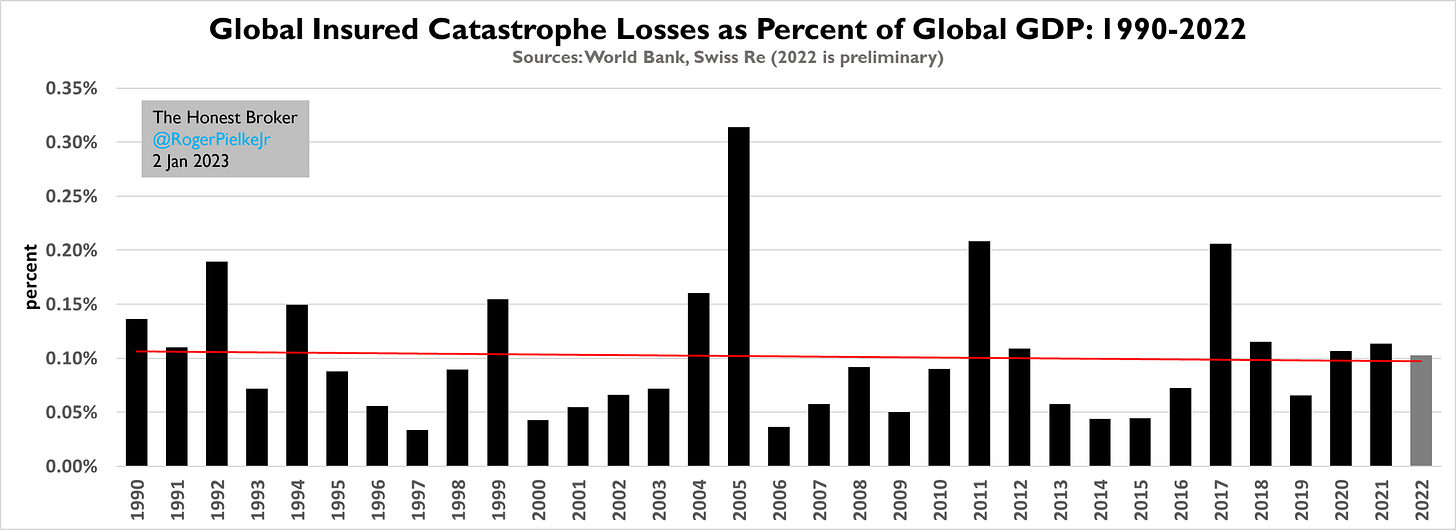 There is no trend in insured catastrophe losses as a percent of global GDP, which suggests that over decades, the industry does an excellent job of managing its exposure and losses. However, if you focus in on just the past 15 years, since 2006, you’ll see that 9 of the 11 years from 2006 to 2016 were well below the long-term trend. That was due in large part to the great U.S. major hurricane “drought” which spanned exactly that period. Since 2017, insured losses have been above-trend in 5 of 6 years, including 2022. Regression to the mean can come as a shock.