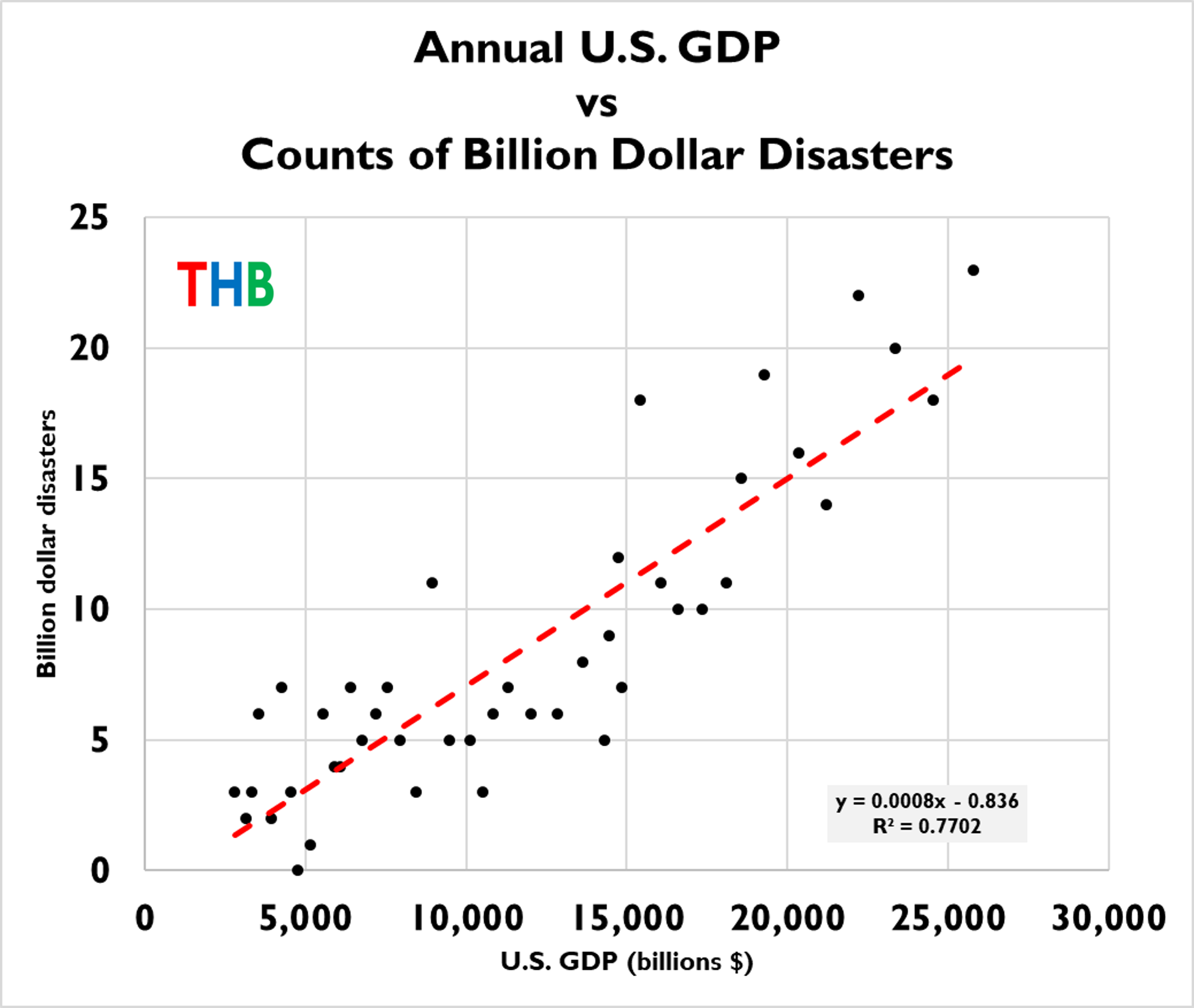Finally, to end the week, here is a bonus graph related to the NOAA “billion dollar disaster” dataset. The figure shows inflation-adjusted annual US GDP versus annual counts of “billion dollar disasters” (from a version of the NOAA data I downloaded in late 2023). As I’ve often said, this is not rocket science.