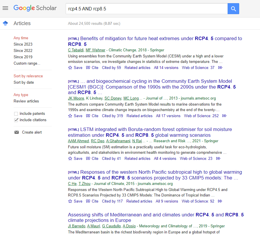 Yet the combination of RCP8.5 and RCP4.5 is endemic across the scientific literature. A Google Scholar search results in 24,500 articles. You can see some of those articles in the screen shot below.