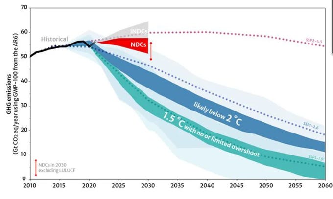 But let’s just assume that RCP4.5 can be used to represent climate policy success, as so many studies represent. If that were the case, then it would be very good news indeed as the latest report of the U.N. Framework Convention on Climate Change shows that the world is on current policies tracking well below an RCP4.5 (SSP2-4.5) trajectory. You can see this in the figure below, with the red cone representing emissions projected under current policies and the purplish dotted line above that indicating a SSP2-4.5 trajectory.