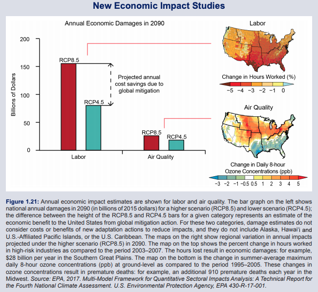 Similarly, the most recent U.S. National Climate Assessment used RCP8.5 paired with RCP4.5, representing climate policy success, to make a case for the benefits of mitigation policy. You can see this in the figure below.