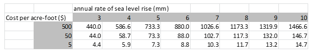 Depending on the rate of sea level rise and the cost to remove sea water from the ocean, the benefits may or may not exceed costs of stopping sea level rise. The table above shows the annual costs of stopping sea level rise at $500, $50 and $5 per acre-foot of sea water. At $500 the annual costs far exceeds the benefits, at $50 the costs and benefits are very close to each other, and at $5 the benefits far outweigh the costs.