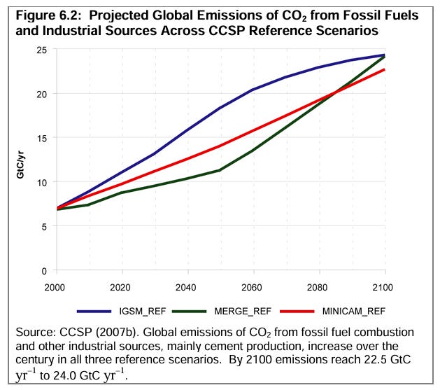 These dated scenarios project ever-increasing carbon dioxide emissions, as shown below from the technical analysis that accompanied the 2009 finding, in the CCSP reports (created as an alternative to a U.S. National Climate Assessment by the Bush administration). Today, we expect emissions to peak soon and decline for the rest of the century, contrary to what was expected back in 2009. An update is needed.
