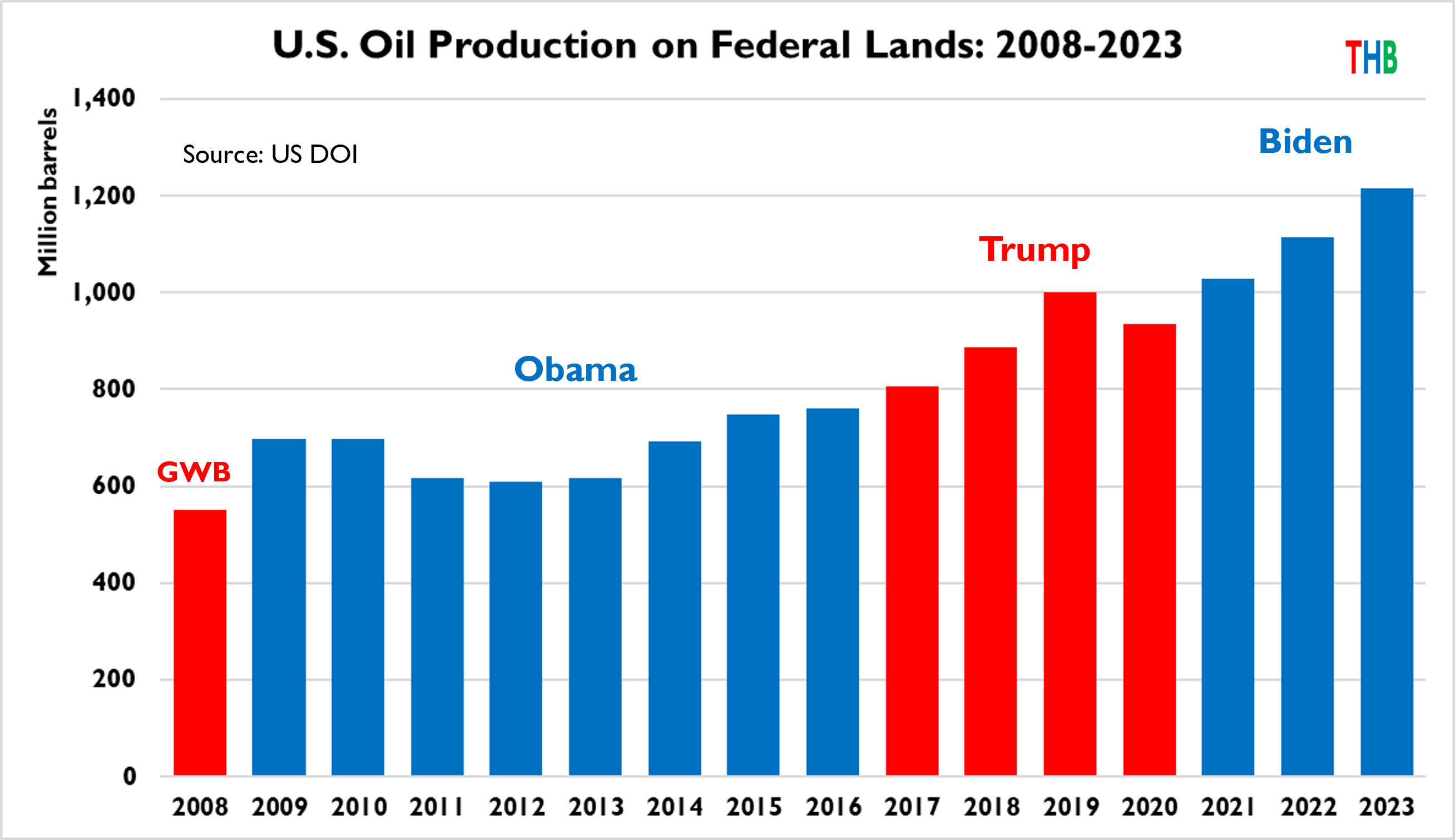 The figure at the top of this post shows U.S. oil production on federal lands from 2008 to 2023, by president. The Biden administration has seen production grow to record levels, continuing a trend that began in 2013, during the Obama administration, interrupted only by the pandemic in 2020.
