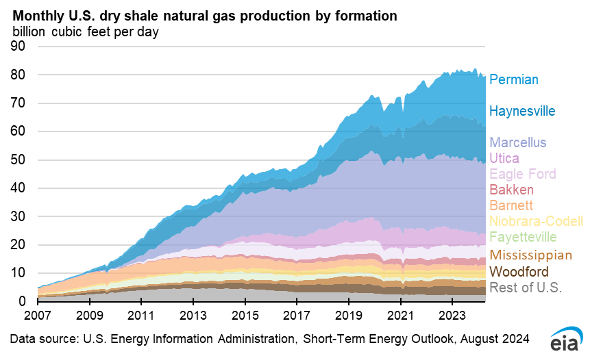 Similarly, the figure below shows that overall U.S. natural gas production (by formation) 2007 to 2023, is also in record territory for 2022 and 2023.