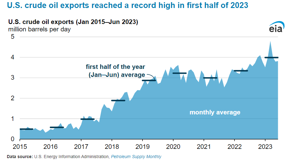 The figure below shows that U.S. crude oil exports — Hold on there. Take a second to realize that we are talking about U.S. crude oil exports — have also increased steadily since 2021 and are also in record territory.