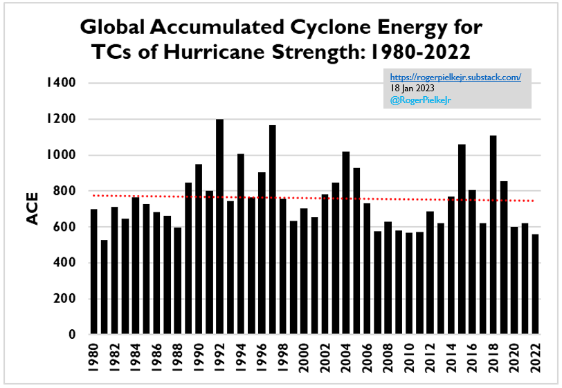 If we look at the “accumulated cyclone energy” (ACE, an integrated value of frequency and intensity) of all global tropical cyclones of at least tropical storm strength, from the CSU dataset, we see no overall trend since 1980, as you can see in the figure below.