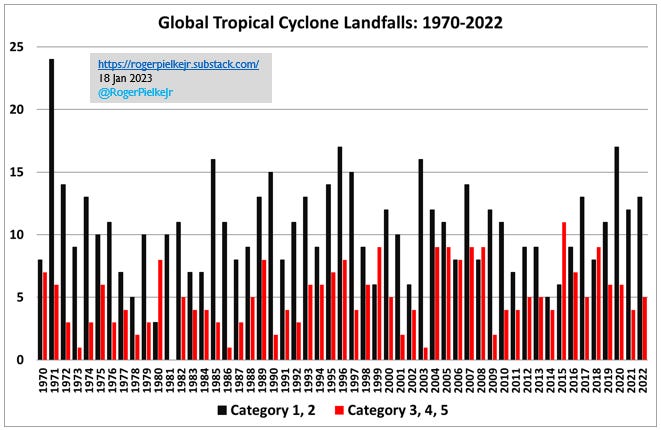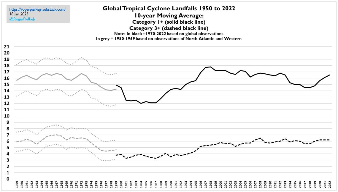 Back in 2012, Jessica Weinkle (@Jessica Weinkle), Ryan Maue (@RyanMaue) and I published in the Journal of Climate the first peer-reviewed paper with a comprehensive dataset of global tropical cyclone landfalls. In 2019 we shared an updated version of the data at the request of the World Meteorological Organization (WMO) as part of their assessment of tropical cyclones and climate change. That WMO assessment was heavily relied on by the most recent assessment of the Intergovernmental Panel on Climate Change.