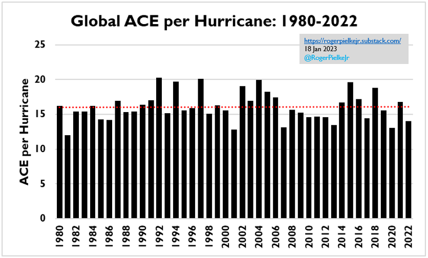 Importantly, when we look at global ACE per hurricane, we also see no trend, as you can see in the figure below. This means that hurricanes to date have not generally become more intense, although they may by later this century. However, as oceans warm, if all else is equal, the maximum potential intensity of hurricanes would increase, and as a result they will have greater precipitation. To date, observational evidence in support of theoretical expectations based on landfalling storms is mixed (see, e.g., here, here, here, here, here).
