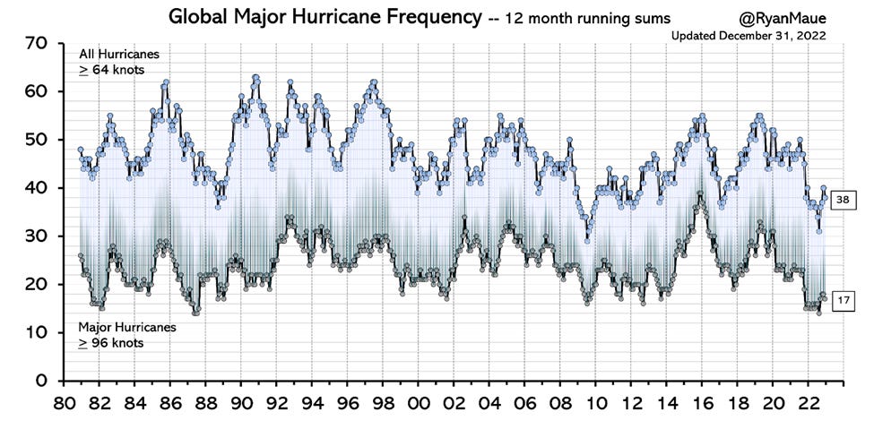 If we look closely at the 12-month sums shown in the figure above we also see that the most recent 24 months has close to the least overall global activity of the past 40+ years, for both hurricanes and major hurricanes. This is not unexpected due to the ongoing triple-dip La Niña that tends to depress Pacific tropical cyclone activity while the Atlantic typically sees more frequent and intense hurricanes.