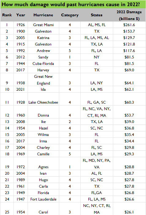 Normalizing the losses for the 1926 Great Miami Hurricane leads to an estimate of more than $260 billion in damage were it to hit in 2022. It is the largest normalized hurricane loss since 1900, based on the damage each hurricane would cause if it hit with today’s level of population and development. The Table below shows the top-25 normalized U.S. hurricanes since 1900, updated from our most recent paper.