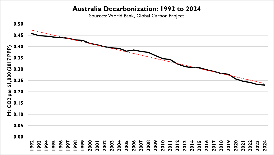 The figure below tells a remarkable story. For all of the sound and fury of Australian climate politics, which have claimed the careers of a few prime ministers, there is no evidence that Australia’s emissions reduction policies have done anything to meaningfully accelerate the rate of decarbonization over many decades.