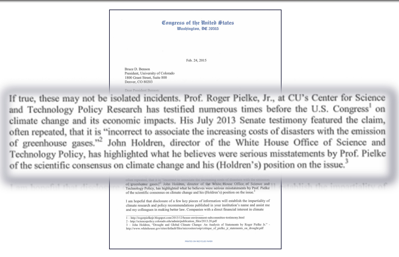 Less than a year later, a member of Congress, Rep. Raul Grijalva (D-AZ) issued a press release announcing that I (and six other university faculty) were under investigation, accused of secretly taking money from fossil fuel companies in exchange for testimony like that I had given before the Senate the year before. In his letter to my university president, Rep. Grijalva specifically cited Dr. Holdren’s missive of misinformation that was on the White House website as evidence of my likely guilt. You can see Rep. Grijalva’s letter to my university and the relevant excerpt citing Dr. Holdren below.