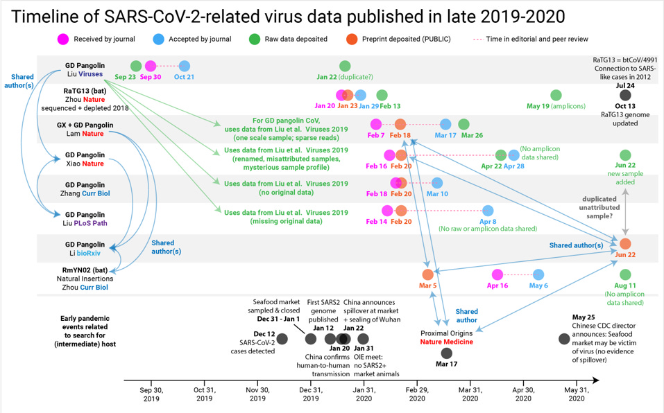 These issues only begin to scratch the surface of what is a complex and technical set of questions involving at least 9 different papers, many authors (with some appearing on multiple papers), even more reviewers, across multiple genomic repositories, journals and pre-print servers. Chan has produced the following timeline which summarizes some key information on some of the most important papers. You can find the many questions raised by this timeline at this 30-part Twitter thread Chan put together last October.