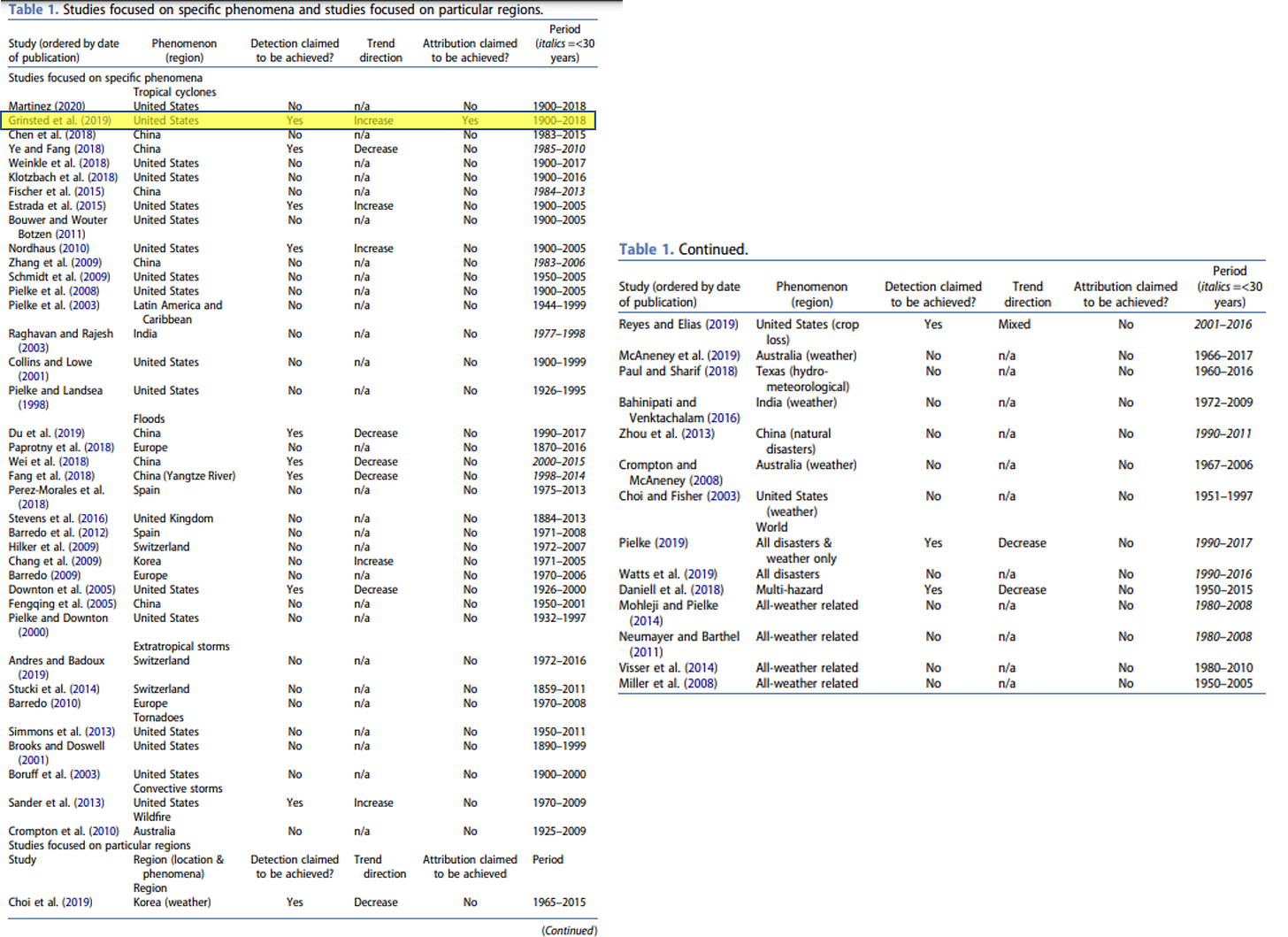 Of these studies only one claimed to have both detected a signal of climate change in the normalized loss records and also attributed that change to the emissions of greenhouse gases. That single paper is highlighted in yellow above. It is also the only normalization paper of these 54 papers that was cited in the IPCC AR6 WG1 report.