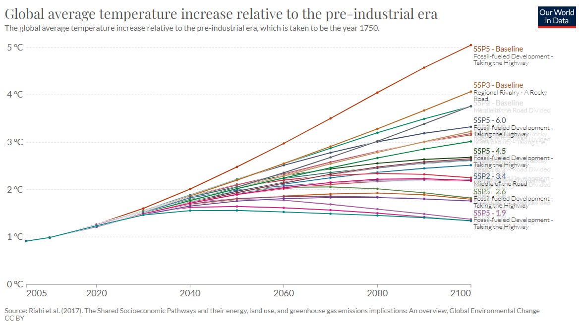 The figure above shows most recent set of scenarios used by the Intergovernmental on Climate Change, called Shared Socioeconomic Pathways (SSPs). There are 26 scenarios shown here, which themselves are a subset of 1,815 scenarios of the IPCC 6th Assessment (AR6). The IPCC assigned no likelihood or probability to these scenarios, they are all by definition supposed to be plausible futures.