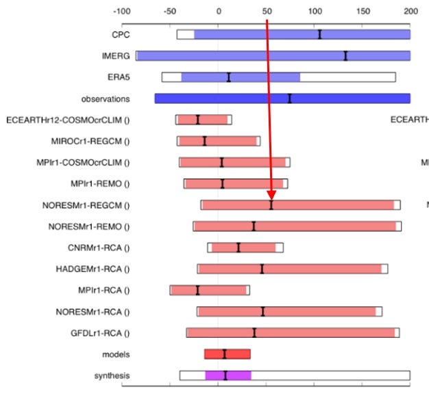 I placed the red arrow on the figure to illustrate the one model that was selected to emphasize in the WWA press release: “Some of these models suggest climate change could have increased the rainfall intensity up to 50% for the 5-day event definition.” This statement was picked up by the media and amplified around the world. No mention was made of the fact that one model indicated decreased rainfall intensity by about 40% and the models together showed no effect of climate change.