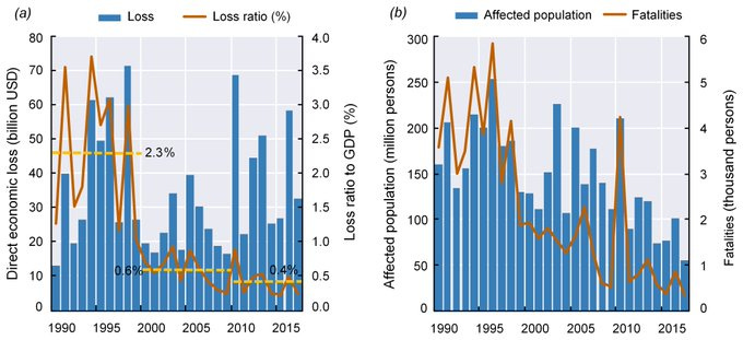 These trends are also global, with a decrease “from around 150m people affected/yr to 40m people & from ~10,000 fatalities/yr to 4,000.” That’s about a 75% decrease in people affected and a 60% decrease in fatalities.