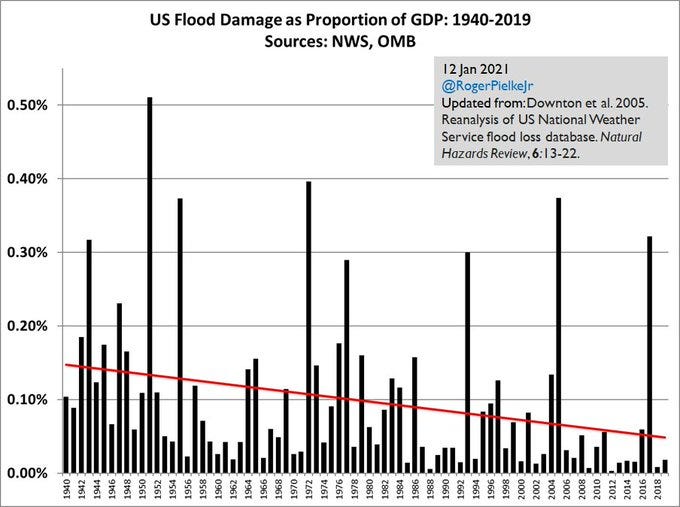 The graph above shows the economic impact of flooding in the United States from 1940 to 2019, updated from a 2005 paper of ours. The figure shows that flood damage in the U.S. dropped as a proportion of GDP by about 70% over 8 decades. That is incredible, and it should be welcome good news. The U.S. is doing much better when it comes to flood impacts that it did during my grandparents’ era.