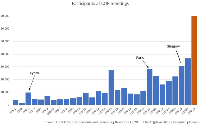 The graph above comes via Javier Blas (@JavierBlas) of Bloomberg, and it shows that COP28 is expecting 70,000 participants, more than double those of COP27. Climate is now a full-scale industry, with fortunes and careers to be made, and perhaps lost. That in itself is not necessarily good or bad — health, defense, finance and so on are also industries. It goes with the territory of being an important policy and political issue.