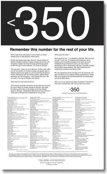 In promoting his new organization worldwide, McKibben partnered with the Tällberg Forum, a Swedish foundation, to promote global advocacy of 350 ppm as a new target for climate policy. Their stated objective was to influence the upcoming major climate conference in Copenhagen at the end of 2009.