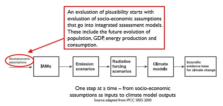 The notion that the climate modeling community should identify emissions scenarios and then, later, integrated assessment modelers should “ultimately” come up with plausible assumptions to justify the assumed emissions gets things exactly backwards.