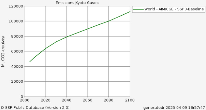 The figure below shows the GHG emissions of SSP-7.0 (where the 7.0 represents the level of radiative forcing in 2100), which exceed 110 gigatons carbon dioxide-equivalent in 2100.