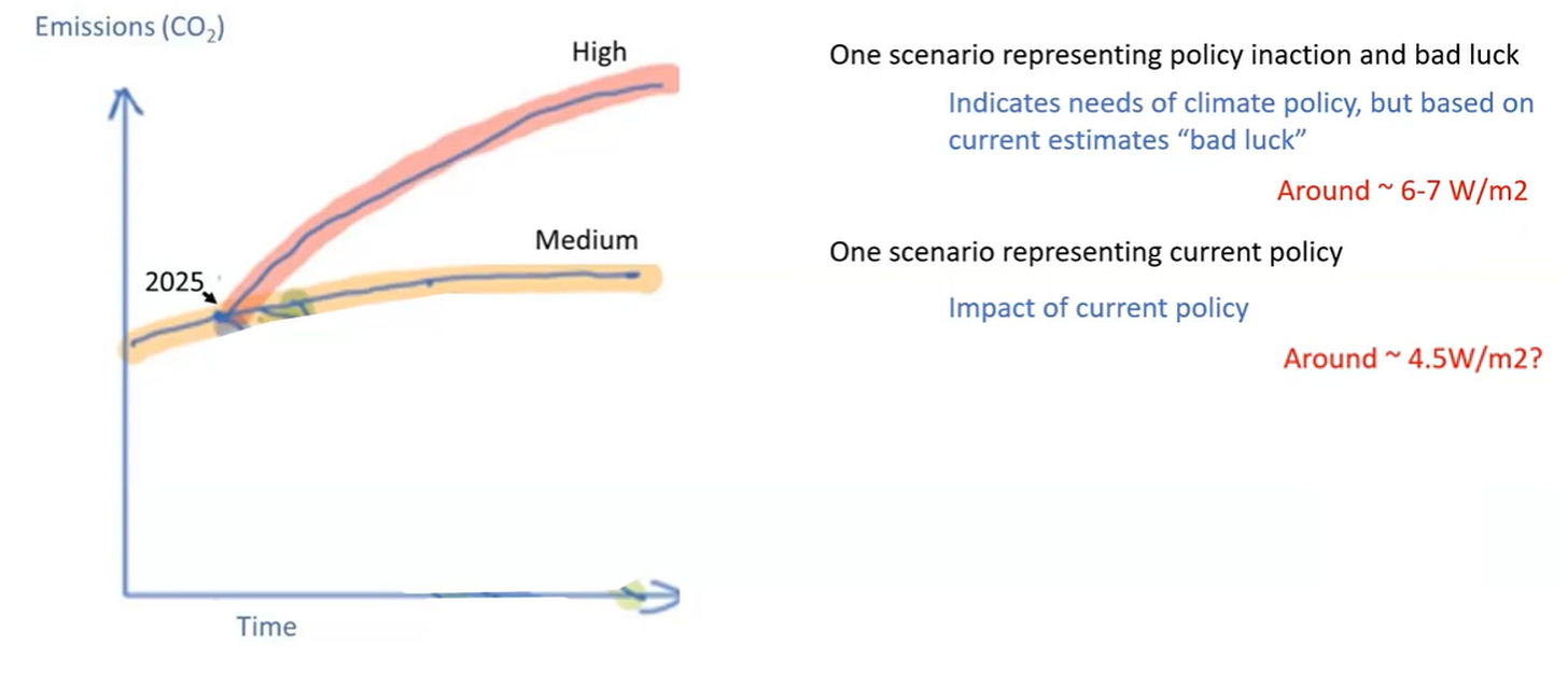 Indeed, in a presentation anticipating the new scenarios, one of its main architects associated the HIGH scenario with a radiative forcing of 6 to 7 Watts per meter-squared, as you can see below in a slide from his presentation. The world is currently undershooting a RCP4.5 scenario, which we’ve known for a while, which sits below the mock-up of the medium scenario in the image below..