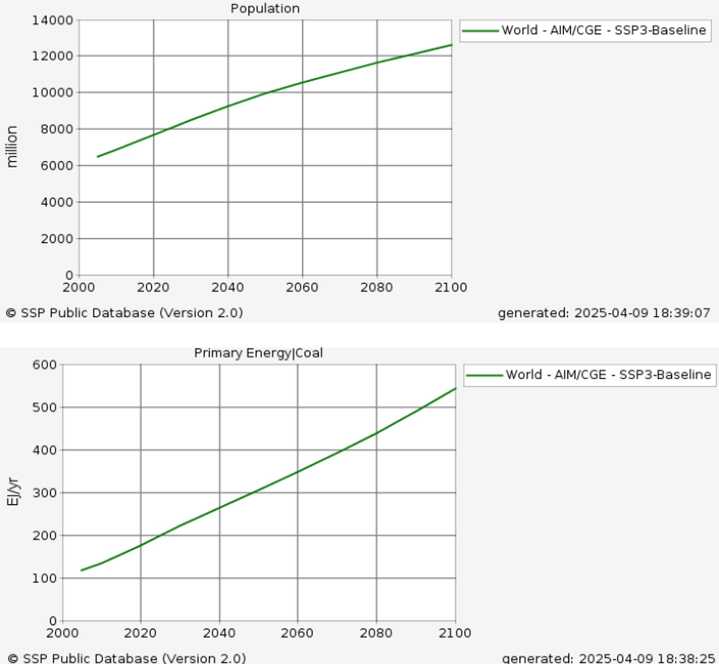 To cite just two examples why we should question the plausibility of a 7.0 W/m^2 radiative forcing scenario — SSP3-7.0 assumes that by 2100 global population will approach 13 billion and that coal consumption will increase five-fold. Neither assumption is remotely plausible in 2025.